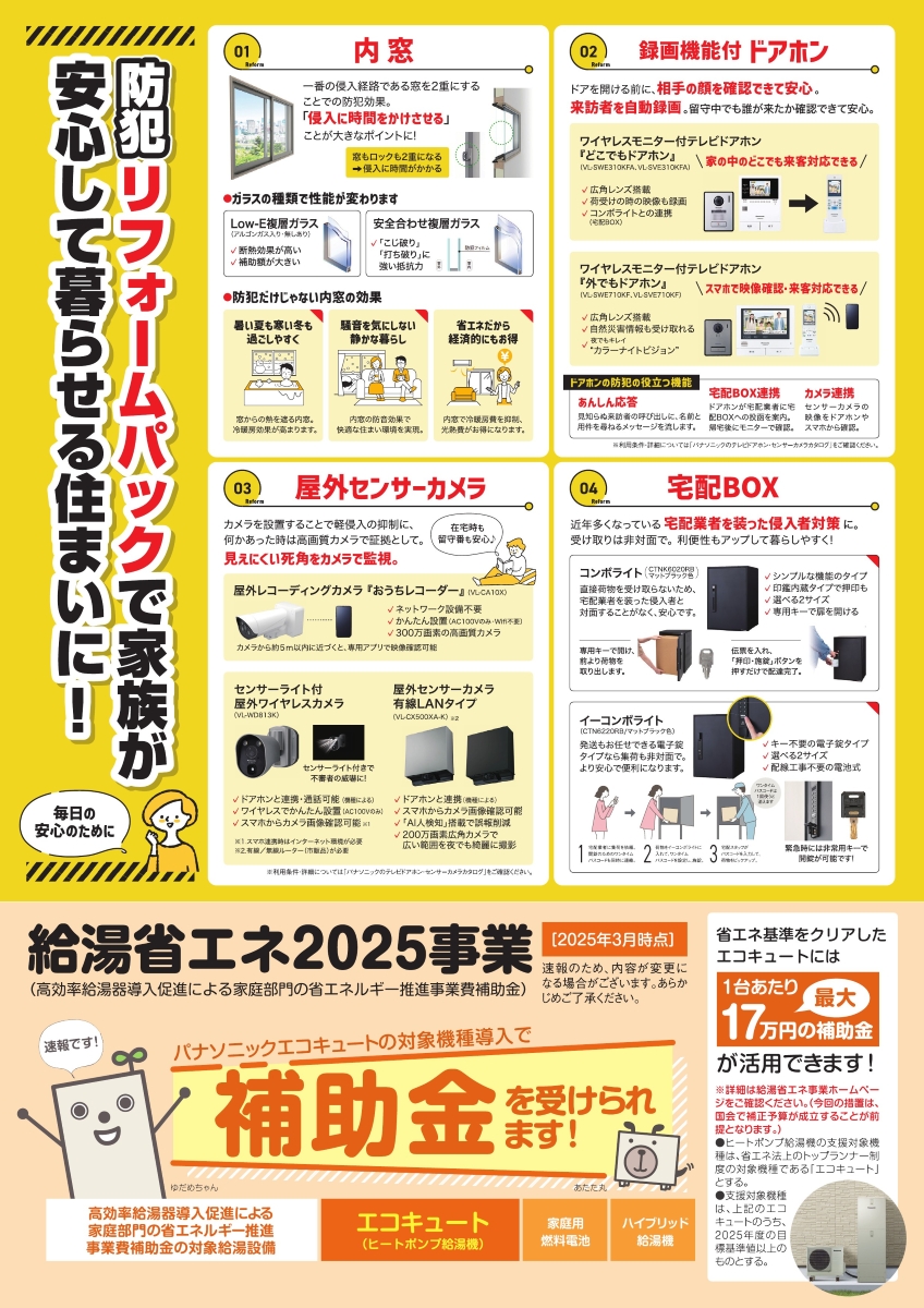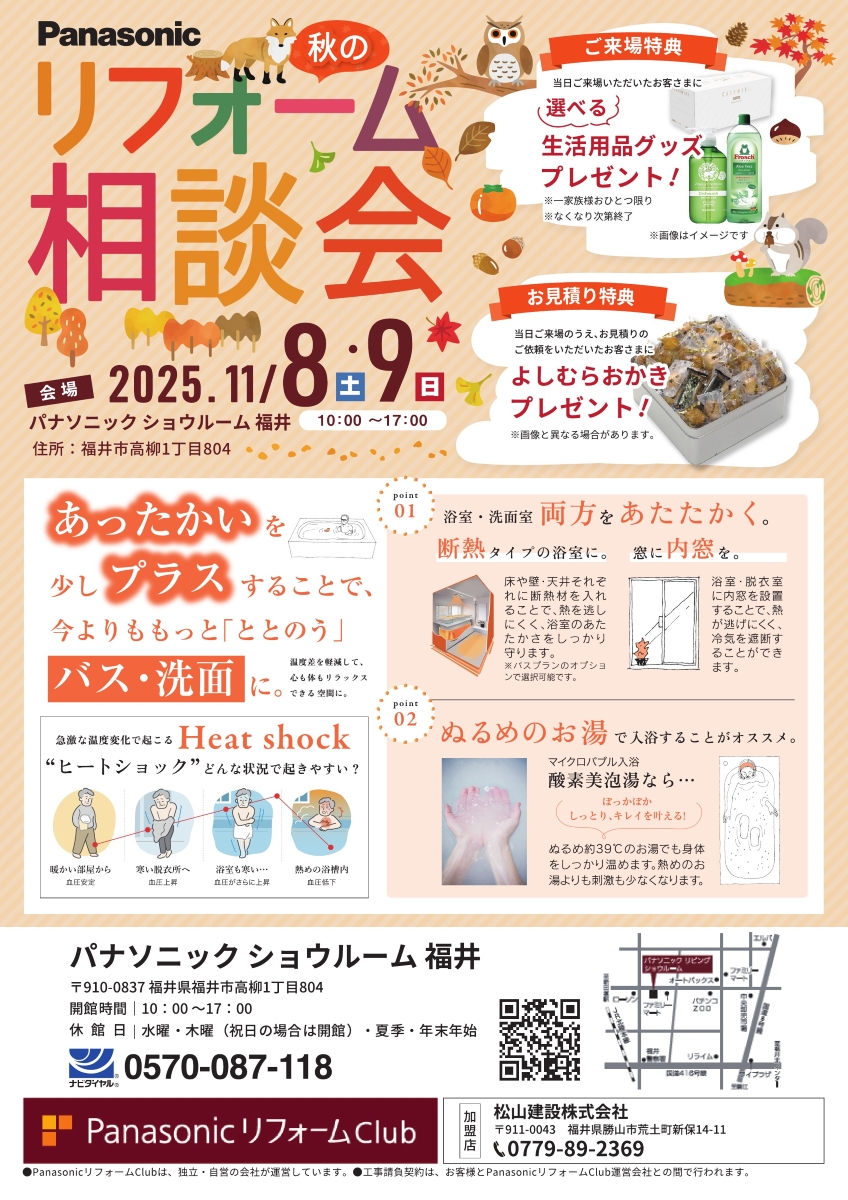 2025年10月20日 2025秋のリフォーム相談会 ■開催日:2025年11月8日(土)・9日(日) ■開催時間:10:00~17:00 ■開催場所:パナソニック ショウルーム 福井 あったかいを少しプラスすることで、今よりももっと「ととのう」 バス・洗面 に。 浴室・洗面室両方をあたたかく。 ・断熱タイプの浴室に ・窓に内窓を ぬるめのお湯で入浴することがオススメ 画像クリックで拡大します